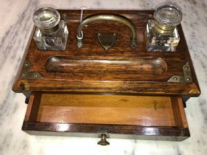 Oak Pen and Ink Desktop BoxVery Nice 1800's Desktop Pen and Ink Box. Two Ink Bottles with Hinged Lids. Single Drawer. Excellent Condition. $95.00