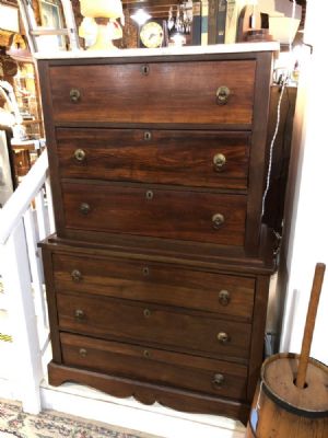 Beautiful circa 1830-1850 2 Piece Marble Top Walnut Highboy Chest of Drawers. 8 Drawers with original pulls (one pull ring missing). All drawers are pegged. Marble top lifts off top section of drawers and top section lifts of bottom section of drawers. This is a very early piece in excellent condition. Chest is 39 1/2" wide and 59 inches tall. $1,985.00