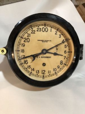 U.S. Government Ships Clock with Key. Manufactured by the Chelsea Clock Company. Excellent working condition. Face diameter is 6 1/2" and the back diameter is 7 1/2". $675.00